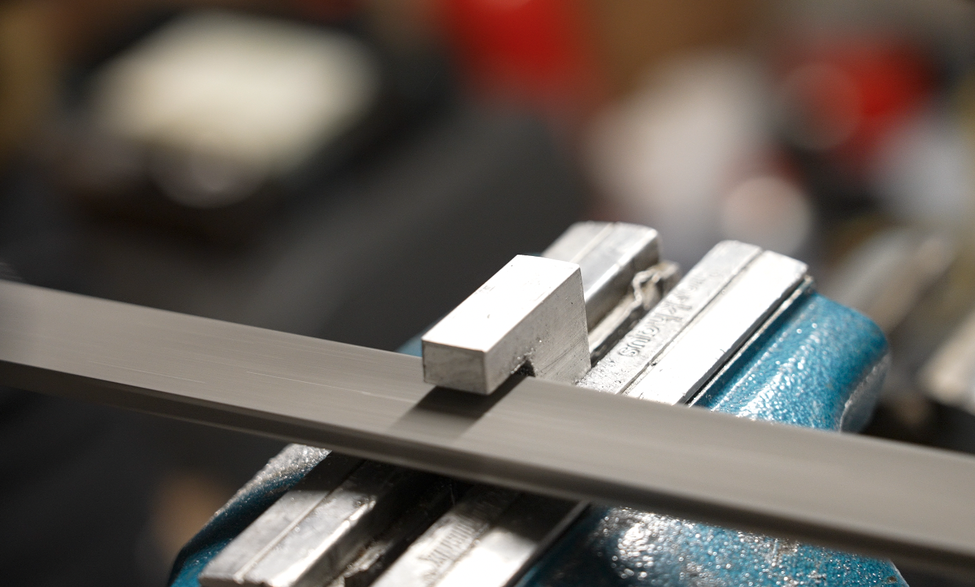 Es gibt zwei Niederhalter. Ein Niederhalter ist aus Federstahlblech und kann in der Höhe justiert werden. Der zweite Niederhalter ist aus Edelstahlprofil hergestellt und mit Filz belegt worden. Dieser wird per Hand geführt und ist daher sehr flexibel einsetzbar.