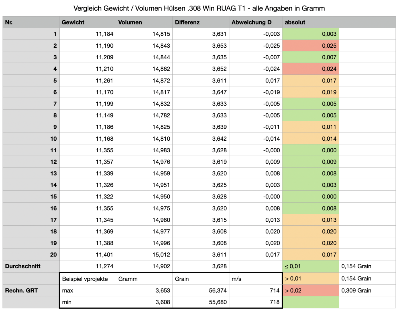 Entschuldige Chris, aber das verwechselst du was. Das Volumen beinhaltet das Gewicht inkl. Hülse und ist nicht das Innenvolumen. Das steht in der nächsten Spalte und ist die Differenz aus Hülsengewicht und Gesamtgewicht. Und das korreliert keinesfalls mit dem Gewicht der Hülse.